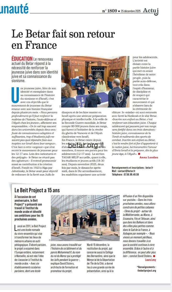 Betar France was recently mentioned in a media outlet, highlighting the movement’s essential role in strengthening Jewish identity and Zionist pride among younger generations.